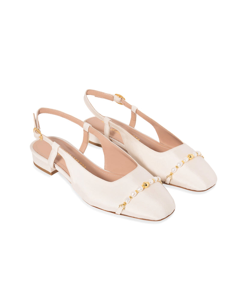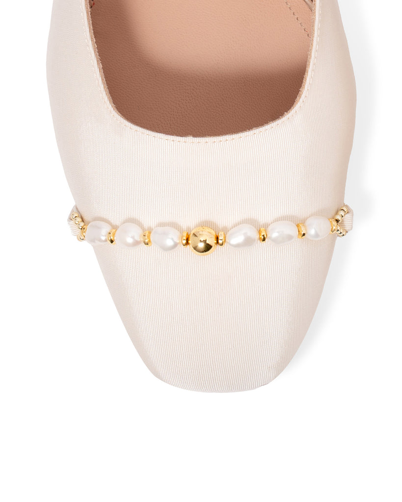 The Fiorentina "Made with Amore" is a slingback in soft and comfortable gros grain and goatskin lining, embellished with precious accessories in freshwater pearls, made and assembled by hand.
