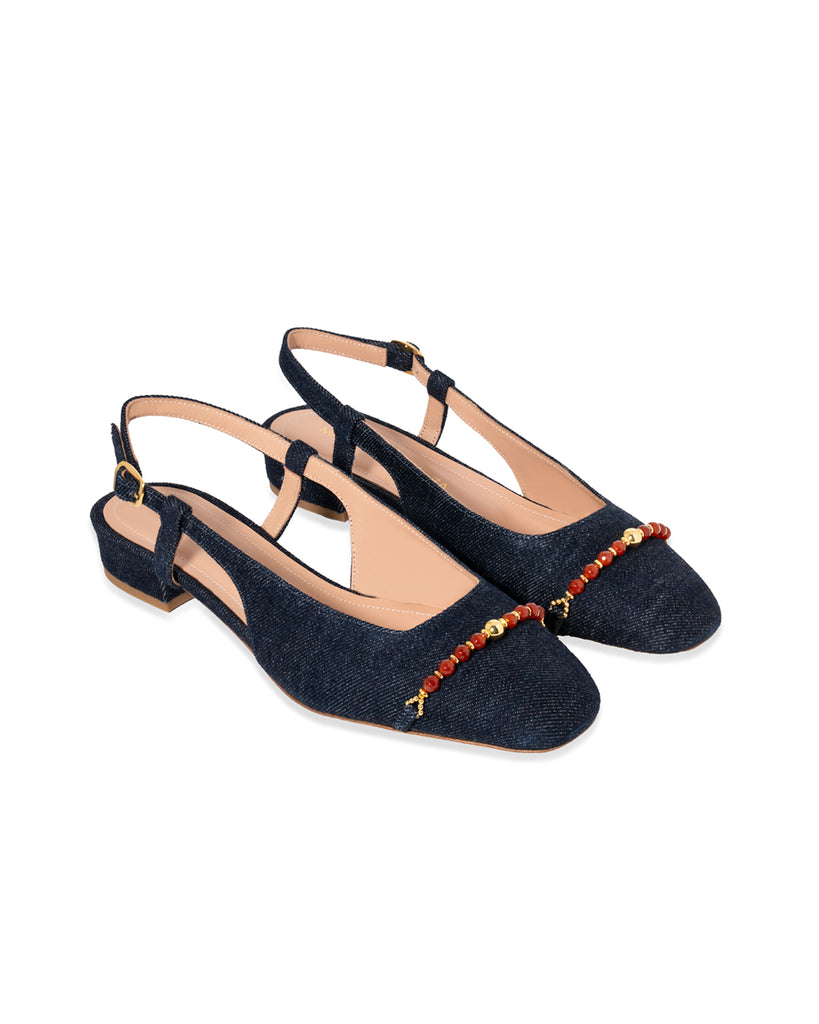 Slingback in soft denim and goatskin lining.