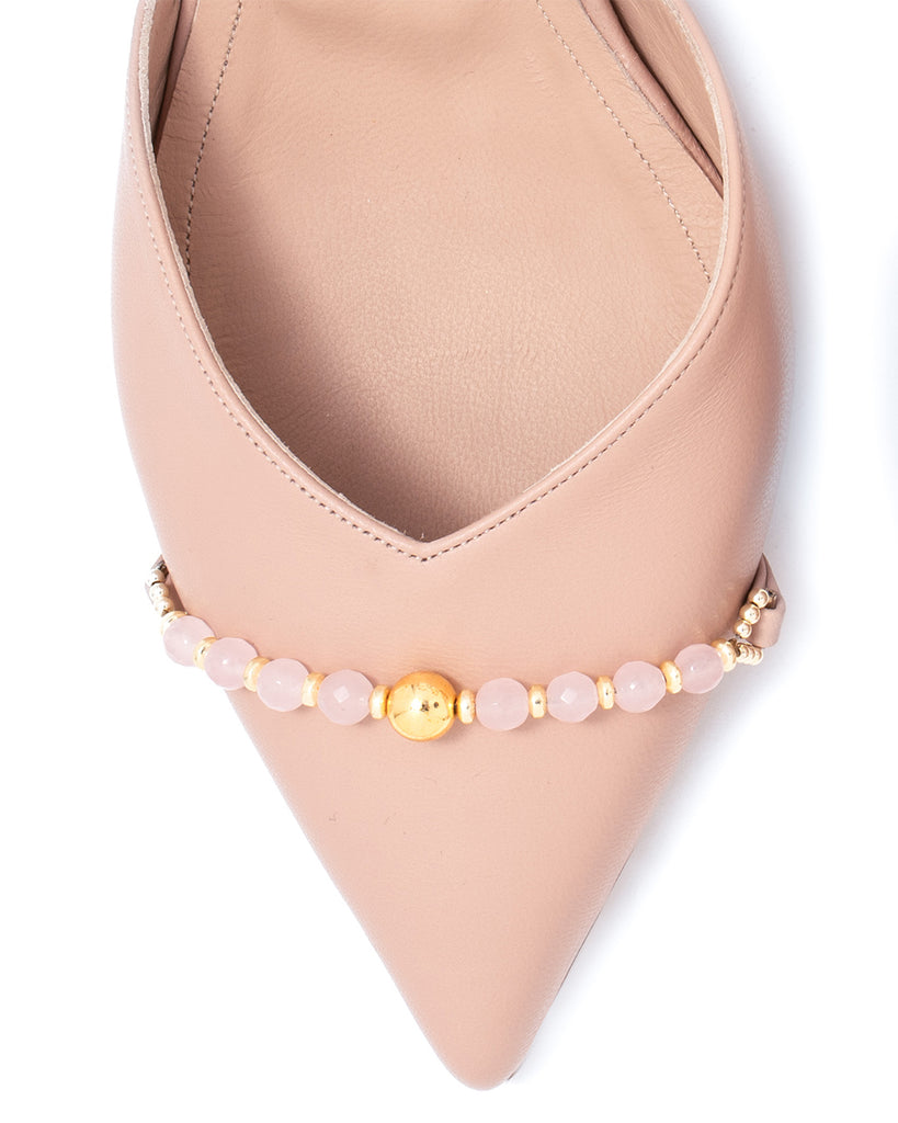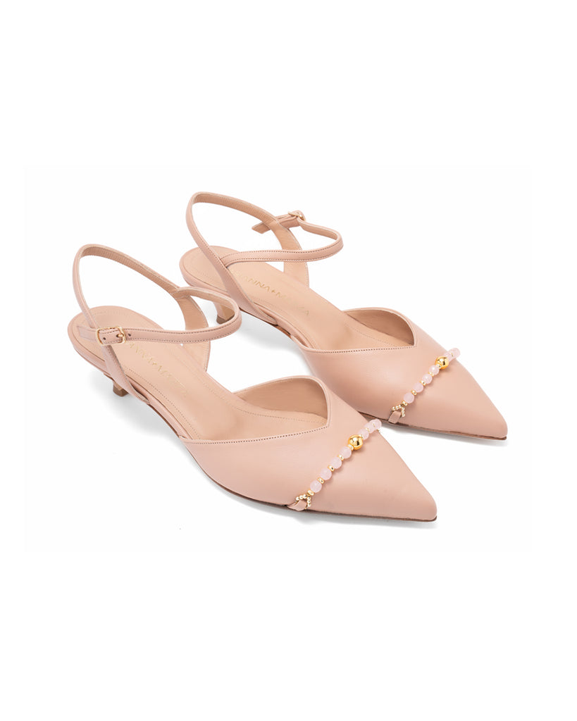 Sporty and fun, it is embellished with handmade pearl accessories.